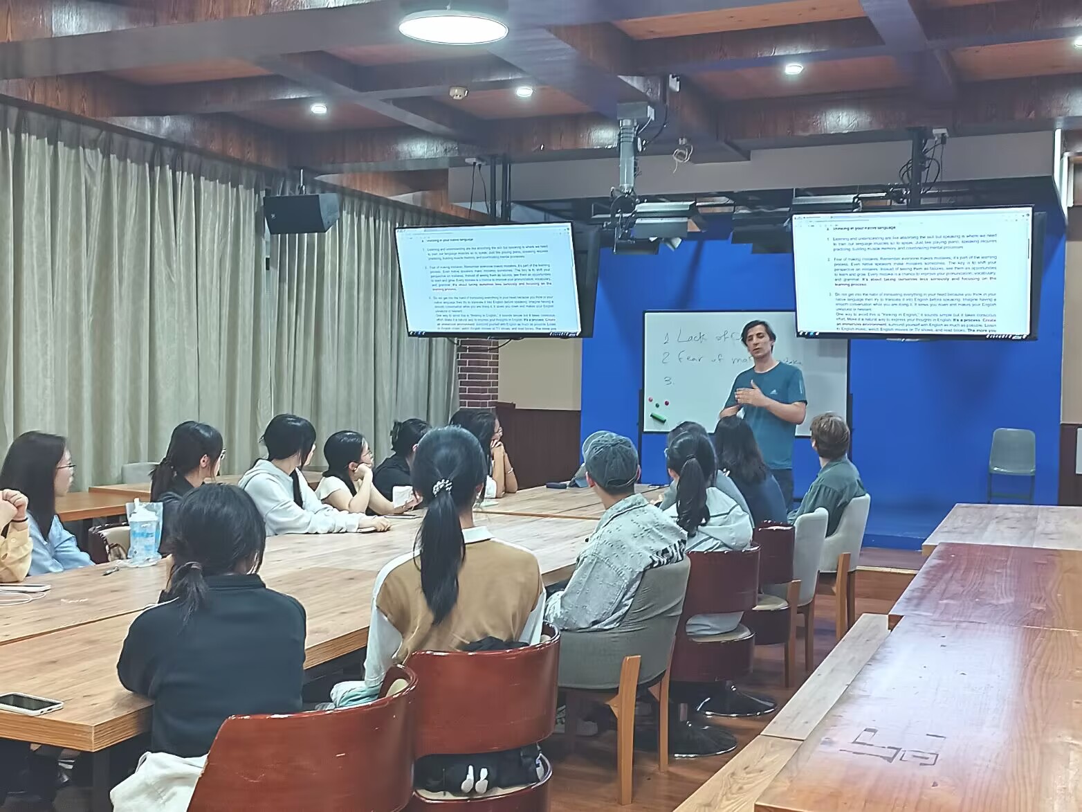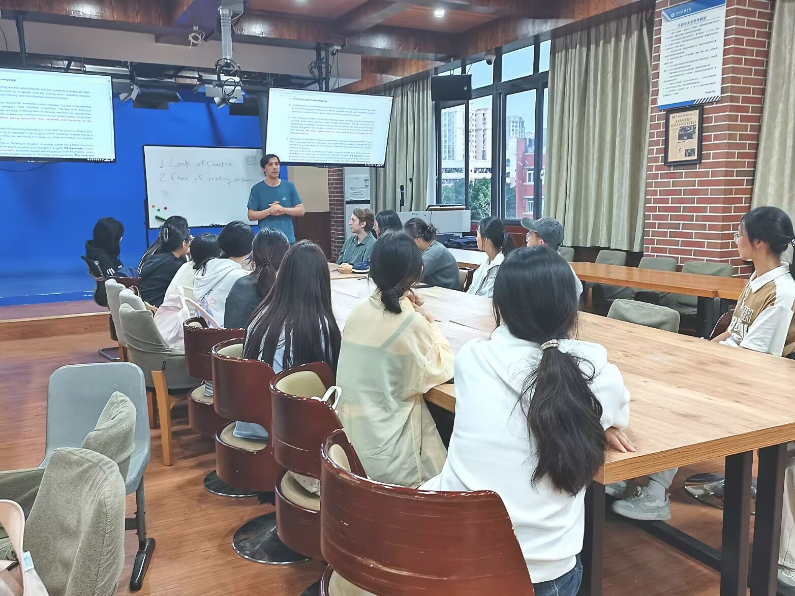 本次活动主要分为认知破局、技巧学习、沉浸式互动实践三个环节。在“认知破局”环节,Hamed老师深度拆解“开口必须完美”等口语学习误区,剖析口语能力“英语思维+表达输出”的核心本质,引导学生正视口语练习中的错误,将其视为宝贵的改进契机,建立以交流为目标的学习理念,为后续口语提升筑牢认知根基。在“技巧学习”环节,Hamed老师结合自身语言教学经验,系统讲解“影子跟读”等核心技巧,通过现场示范母语者发音、语调模仿要点,直观展现技巧应用逻辑,示范模仿发音语调。同时,围绕日常交流高频场景,梳理并解析核心短语的功能与适配场景,强调其在构建流畅对话中的基础作用,引导学生通过针对性练习提高英语表述能力。在“沉浸式互动环节”,Hamed和Tycho两位老师全程参与引导,同学们以小组为单位,开展“日常生活描述”“照片故事描述”等活动,不仅将时态知识灵活运用到口语表达里,还在协作分享中拓展了词汇量、提升了叙事逻辑,切实感受到了口语表达从“敢说”到“会说”的进步。