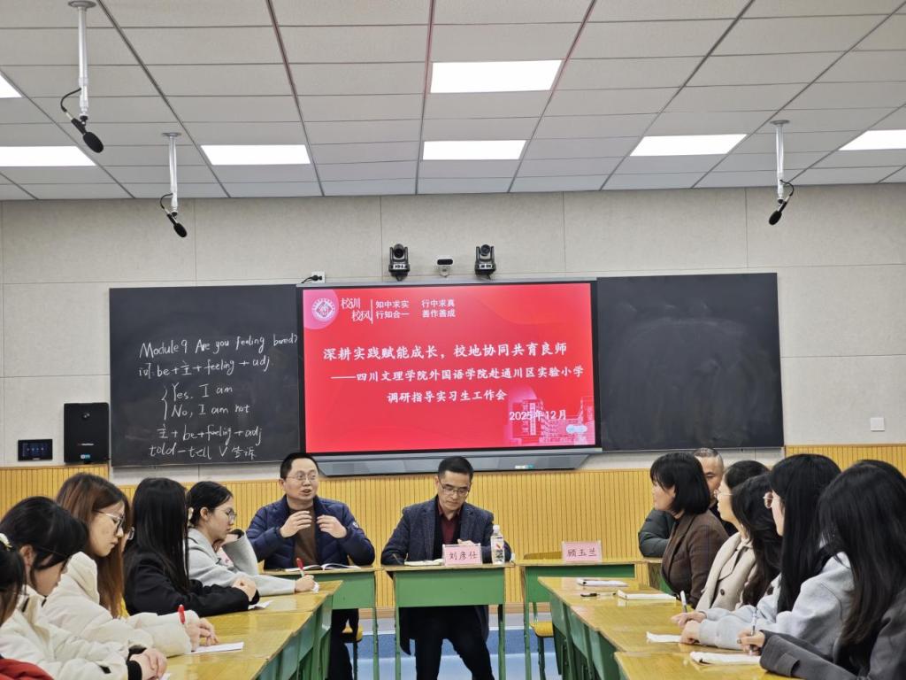 2025年12月18日下午,学院副院长(主持工作)刘彦仕带队赴通川区实验小学开展“深耕实践赋能成长,校地协同共育良师”实习检查活动,教学副院长张建华、教研室主任顾玉兰及实习指导老师郭婷同行。通川区实验小学党支部书记、校长付黎明率校领导班子及英语教研组全体教师接待并召开欢迎座谈会。